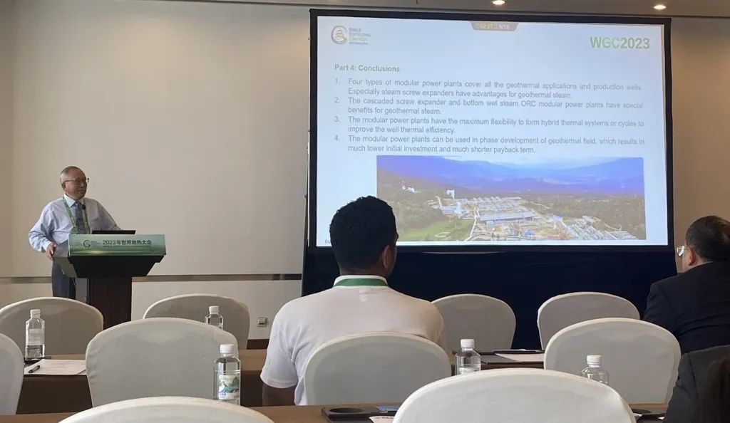 9月16日,公司總經(jīng)理、開山地?zé)峋谀K發(fā)電技術(shù)創(chuàng)始人湯炎博士參加2023年北京世界地?zé)岽髸╓GC),并受國際地?zé)釁f(xié)會(IGA)首席執(zhí)行官M(fèi)arit Brommer女士邀請,做了題為《使用地?zé)崮K電站提高地?zé)峋a(chǎn)量》(Improving Well Power Output Using Modular Geothermal Power Plants)的專題報(bào)告。