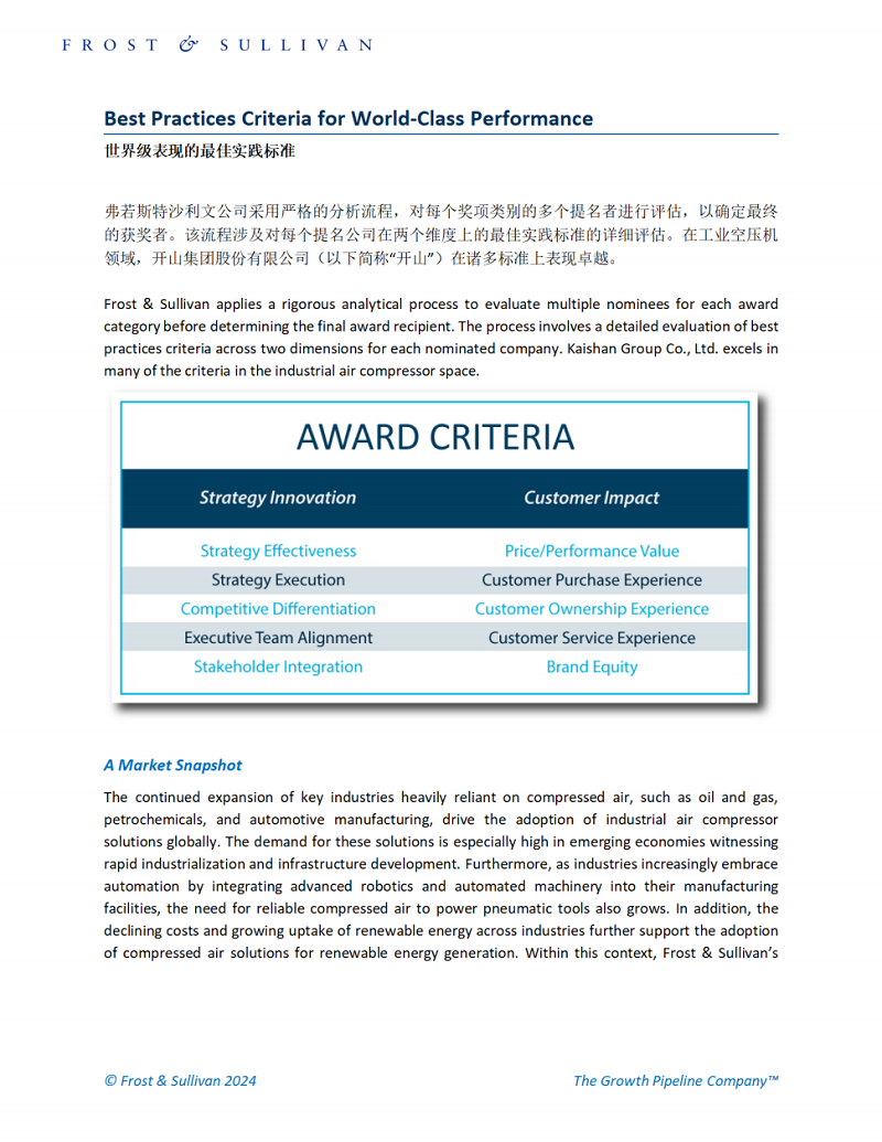 Frost & Sullivan對開山獲得“全球工業(yè)壓縮機(jī)競爭戰(zhàn)略領(lǐng)導(dǎo)獎(jiǎng)”的頒獎(jiǎng)詞